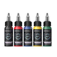Professional Tattoo Ink Set: Includes Black Vow, Inferno Red, Cobalt Realm Blue, Undying Dawn Yellow, and Emerald Omen Green, each in 30ml bottles.