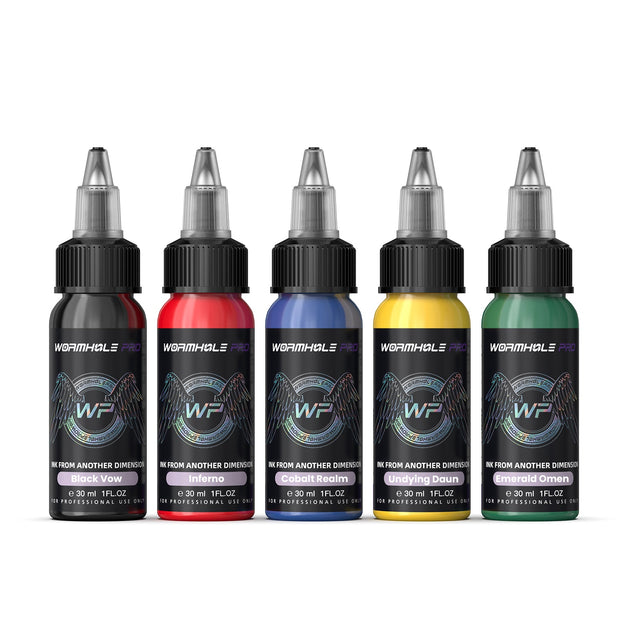 INK FROM ANOTHER DIMENSION – WormholePro delivers a professional tattoo ink set designed for artists who need reliable performance, bold pigmentation, and lasting results. This 5-color collection offers everything a tattoo studio requires for lining, shading, blending, and vibrant color packing.