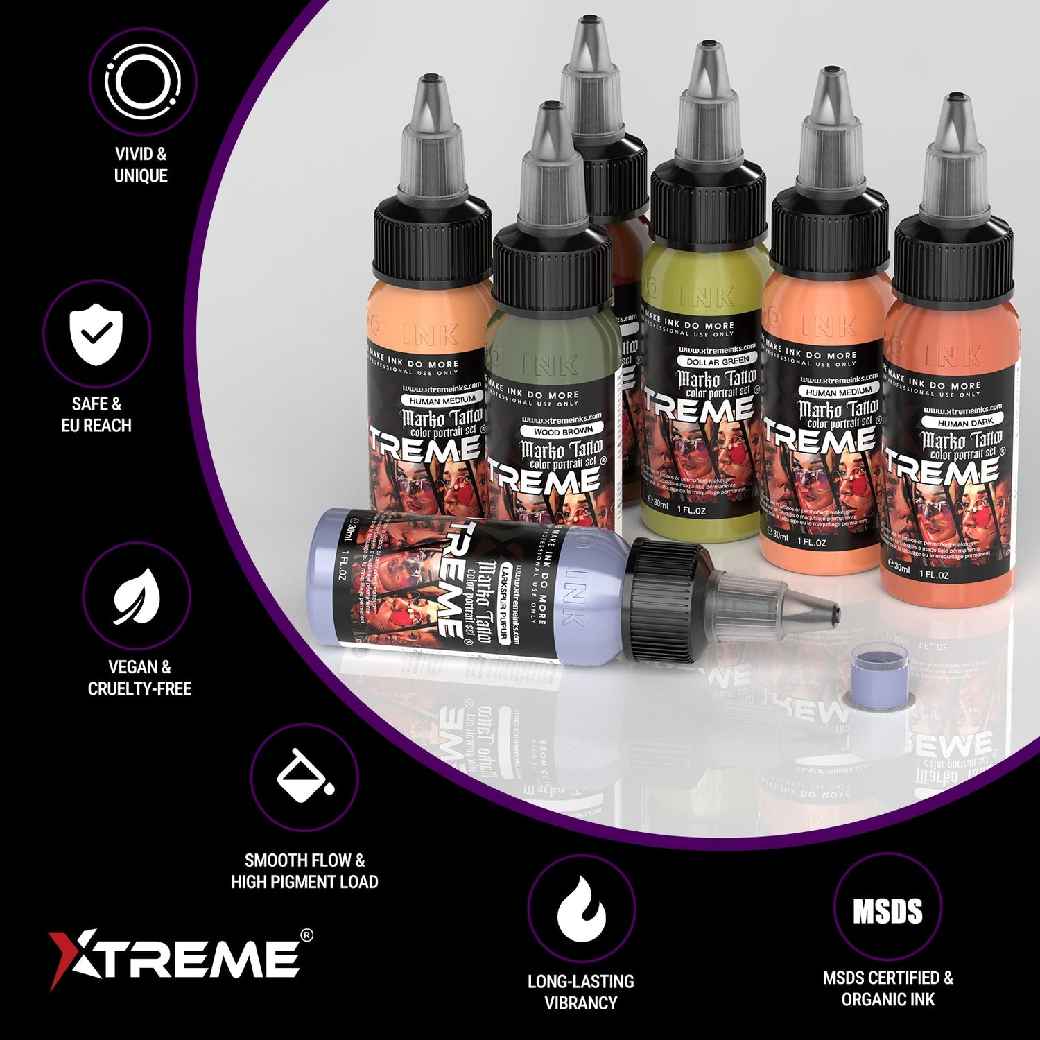 Marko tattoo ink set, color realism tattoo ink, portrait tattoo ink collection, xtreme inks for portrait work, 12 color tattoo ink set, tattoo ink for skin tones, marko xtreme color set, wormhole tattoo xtreme inks